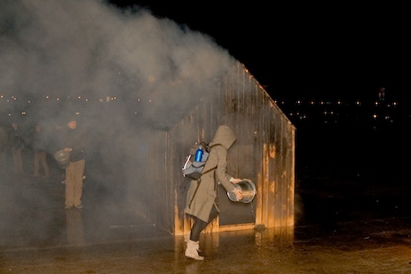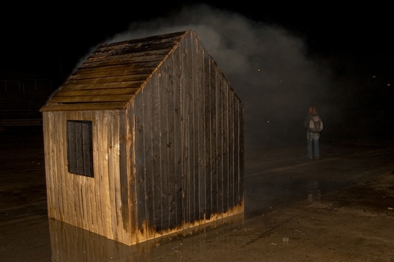 Dieses Happening war Bestandteil eines „Demokratiespaziergangs“ mit zahlreichen anderen Beiträgen zum Schicksalsdatum der Deutschen, veranstaltet von der Bürgerinitiative Bürger.Courage am 9. beziehungsweise 10. November 2006 in Dresden. In Kooperation mit dem Künstler und Bühnenbildner Johannes Köhler entwarf ich ein simples Holzhaus, das im Laufe des Besuches der Spaziergänger durch einen Trick in Brand gerät. Die Nähe zum Ufer der Elbe sowie eine angedeutete Reihe leerer Blecheimer forderte die Teilnehmer auf, eine Kette zu bilden und das Haus zu löschen. Grundlage der Idee war mein Interesse an der Untätigkeit und Sensationsgier vieler Deutscher während der Pogromnacht 1938, der zahlreiche Synagogen zum Opfer fielen, und die das Vertrauen der jüdischen Bürger in ihre nichtjüdischen Mitbürger nachhaltig zerrüttete. Das Moment der Zivilcourage verbunden mit der Frage, wie eine moderne, demokratisch verfasste Gesellschaft heute damit umgehen würde, war für diese Arbeit ausschlaggebend.